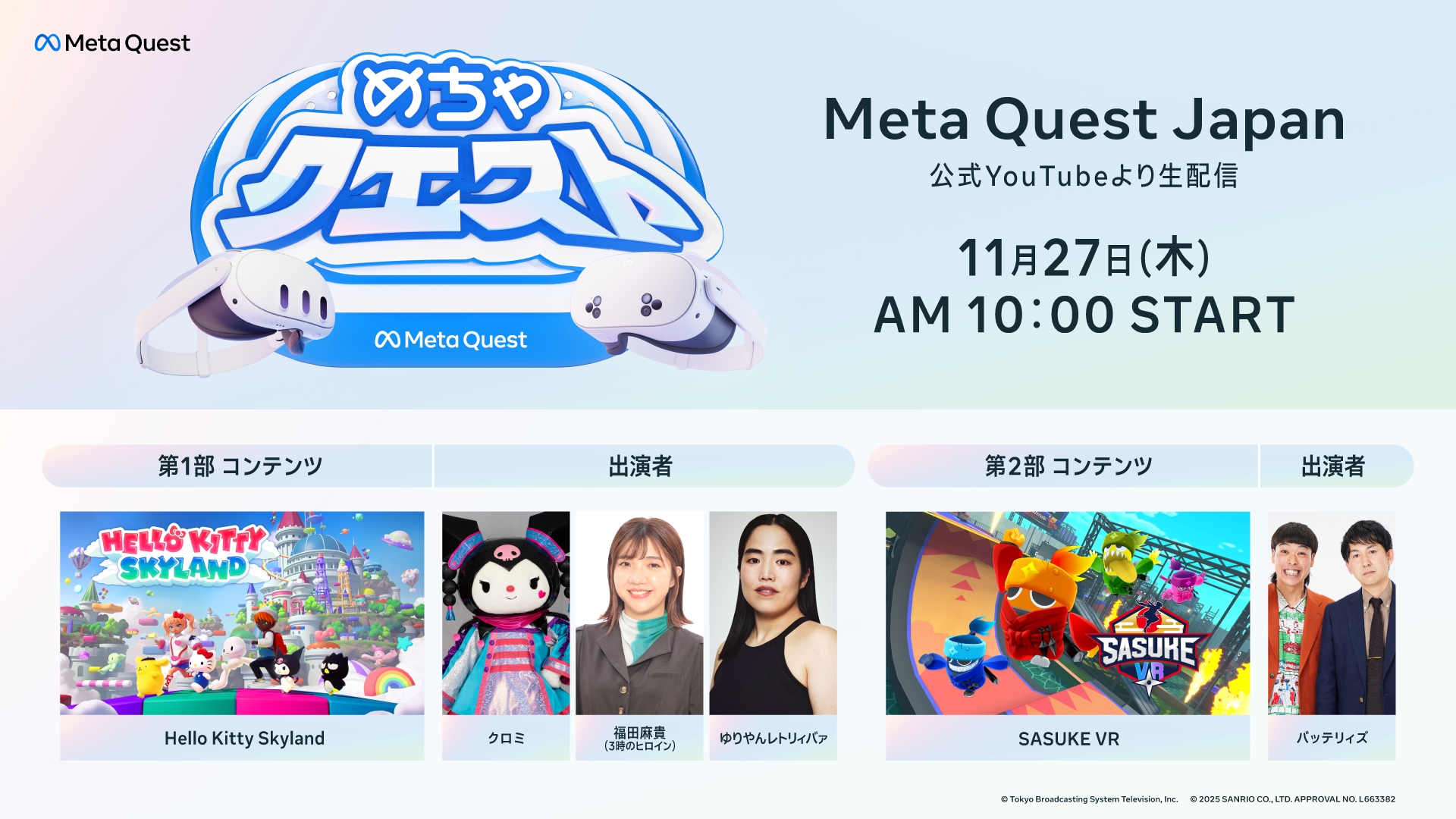 さらに、この秋冬に登場するコンテンツ2作品にフォーカスを当てるトークイベント「めちゃクエスト」が、11月27日(木)10:00よりMeta Quest JapanのYouTube公式アカウント(@MetaQuestJapan)で生配信されます。