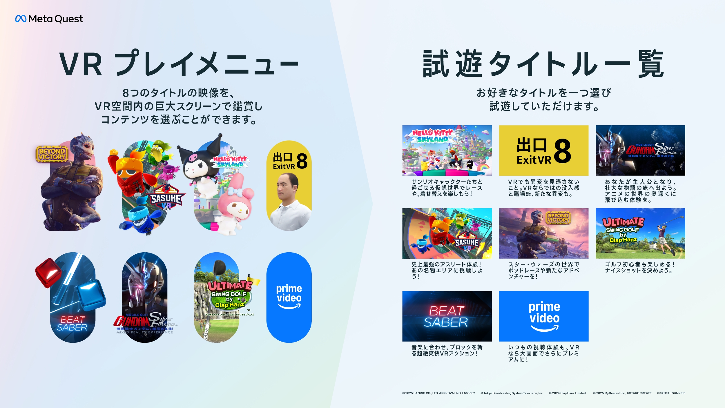 店頭イベントでは、この冬にローンチ予定のソーシャルVRアプリ『Hello Kitty Skyland』や、TBSの人気番組「SASUKE」をVR化した『SASUKE VR』、そして映画化で話題の『8番出口VR』など、計8つのコンテンツが体験可能です。