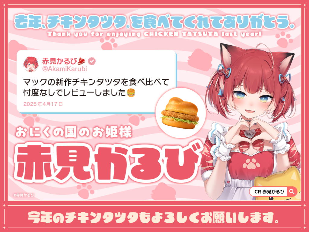 日本マクドナルド公式Xが、ハンバーガーを愛好するVTuberである赤見かるび、渚トラウト、七瀬すずなの3名に対し、感謝のメッセージを投稿した。各VTuberが普段から同社の商品を話題にしていることに対する反応として行われた。