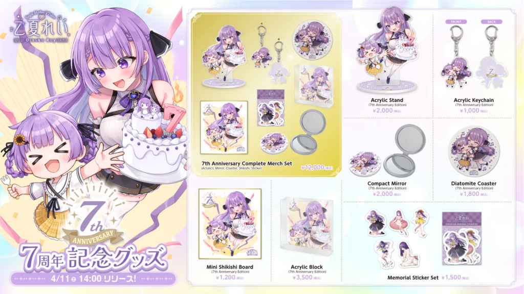 VTuber乙夏れいの活動7周年を記念したメモリアルグッズの販売が開始された。描き下ろしイラストを使用したアイテムのほか、これまでの活動を振り返るメモリアルなラインナップが登場している。