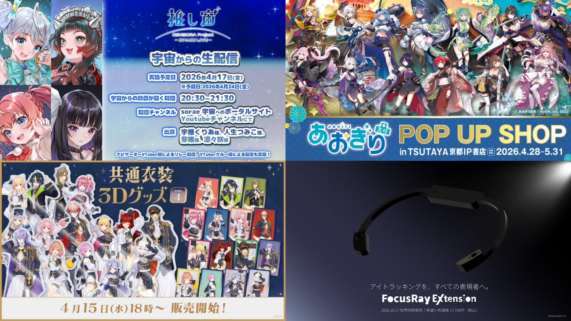 VTuberグループあおぎり高校のPOP UP SHOPが、4月28日よりTSUTAYA 京都IP書店にて開催される。書店のオープン記念企画として、グループのオリジナルグッズが多数展開される。