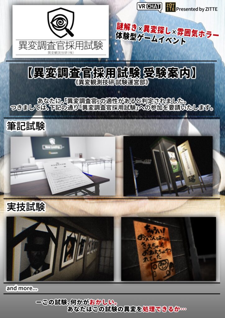 今回行ってきたのは、VRChatイベント異変調査官採用試験。謎解きサークル「ZITTE」が定期開催している、「謎解き×異変探し」を主軸とした体験型ゲームイベントです。